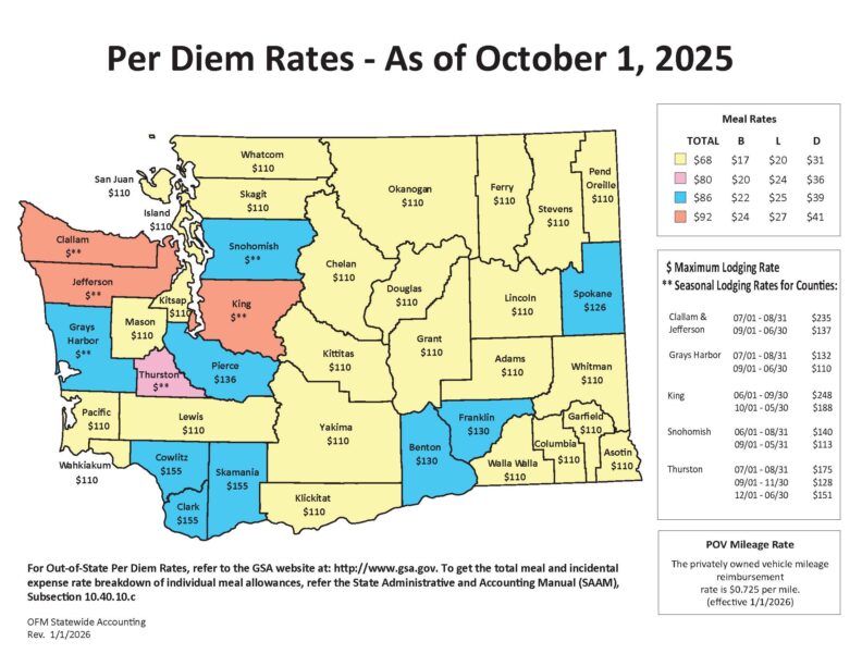 Daily Per Diem Rates include the total of the lodging rate plus the meals and incidentals (M&IE) rate. The rates are set by various state departments based on the locations.